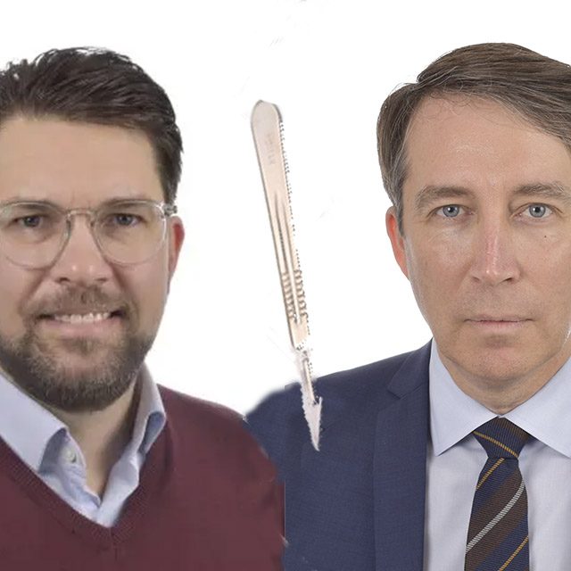 Men plötsligt svängde partiledaren Åkesson efter att ha kommit på att det där med judar inte är så dumt ändå, och ville ändra partiets linje till att förbudet endast skulle gälla muslimer. En intern strid bröt ut. I brist på halvautomatiska vapen drog Jomshof skalpellen, och ska enligt vittnen ha hotat Åkesson med kirurgisk könskorrigering.